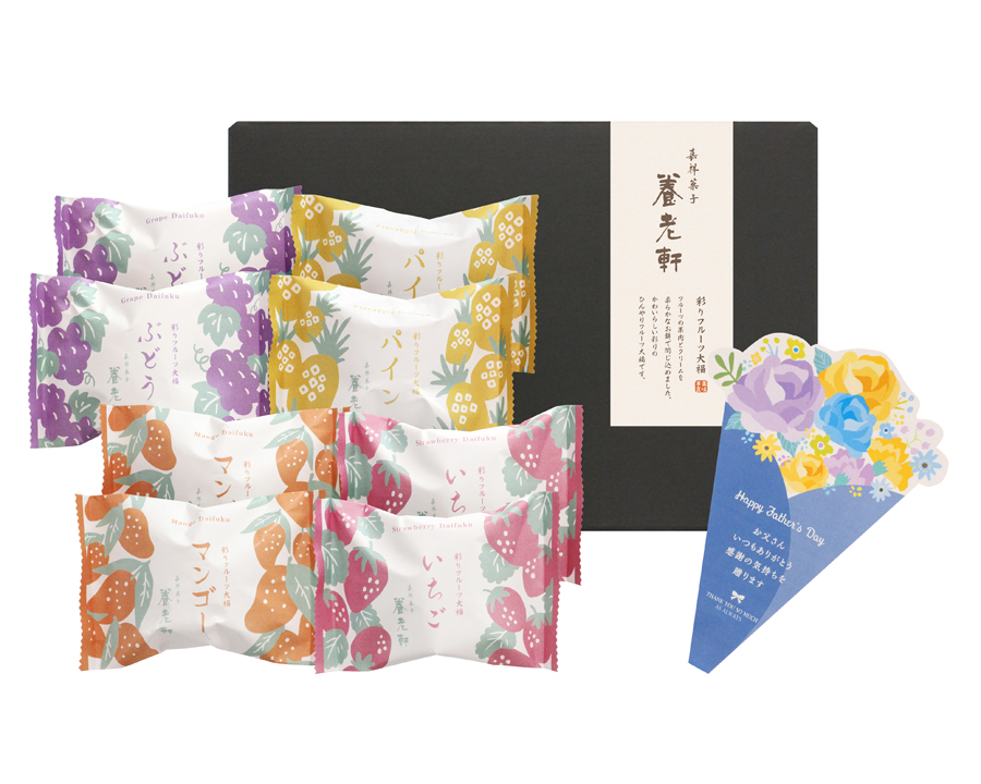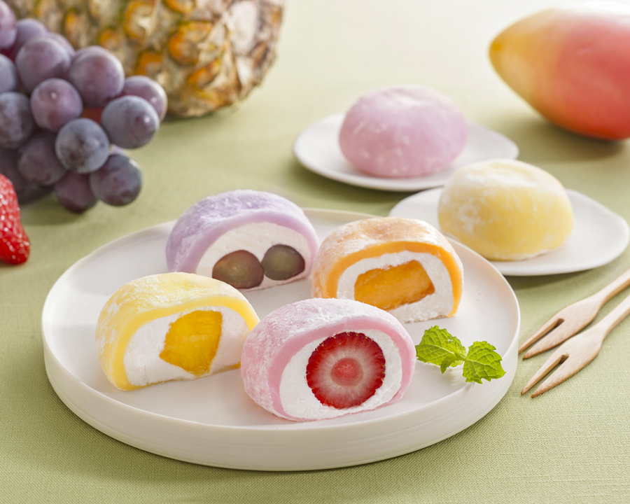 みずみずしいフルーツの果肉とクリームを柔らかなお餅で閉じ込めたカラフルなフルーツ大福です。