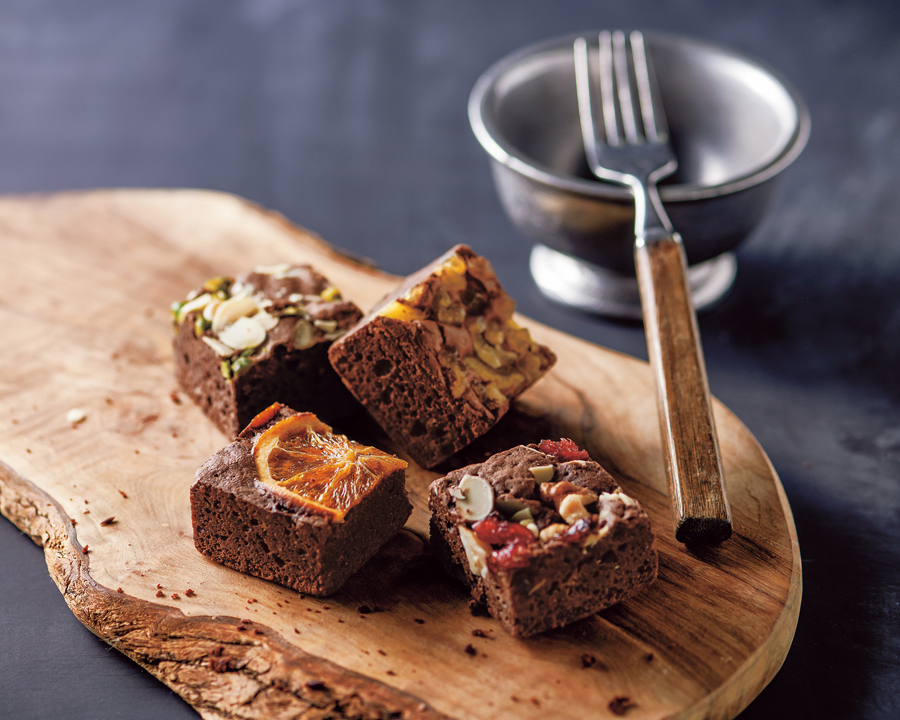 濃厚なチョコレートの生地に、香ばしいナッツや甘酸っぱいフルーツをトッピング。