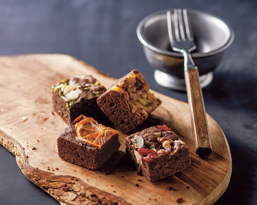 濃厚なチョコレートの生地に、香ばしいナッツや甘酸っぱいフルーツをトッピング。