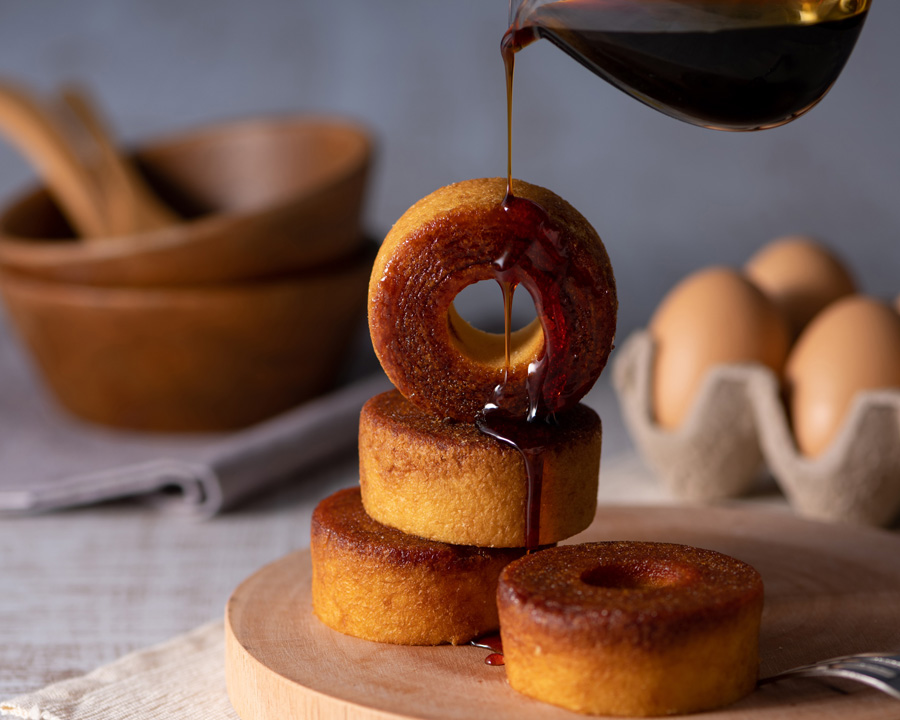 しっとりバームクーヘンにカラメルソースをまとわせ、砂糖をかけてさらに焼き上げた
