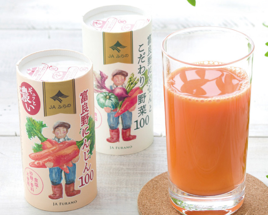 富良野にんじんを使用したにんじんジュースと、こだわりの野菜を加えたにんじんミックスジュースの詰め合わせ。