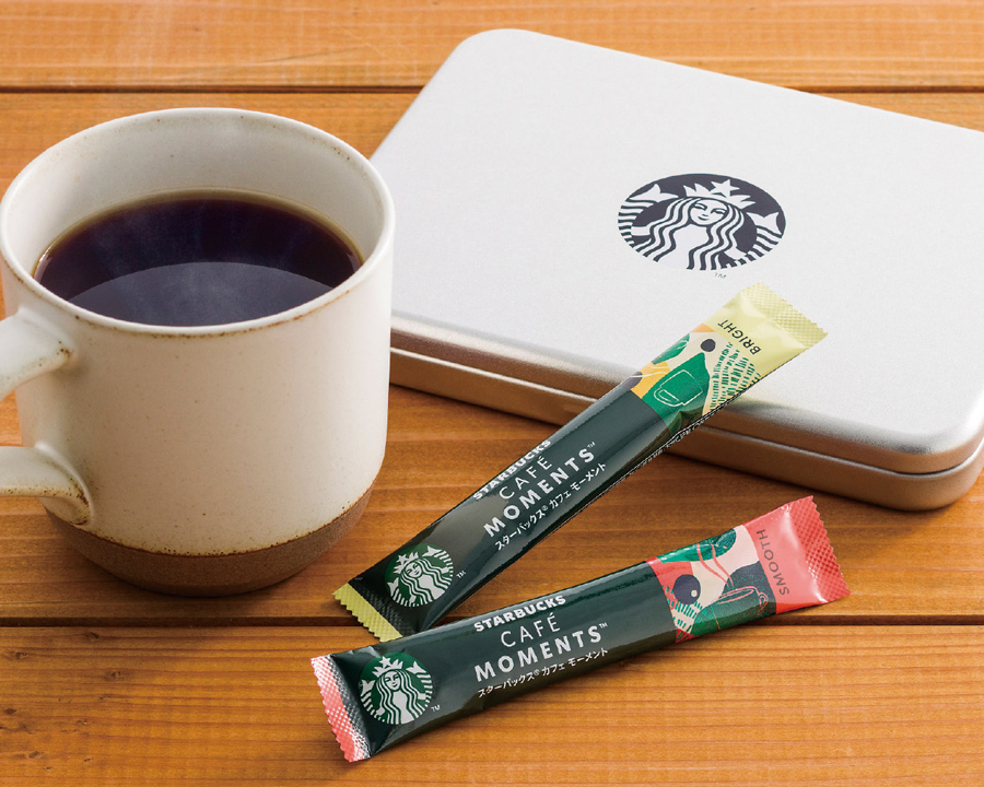 「スターバックス カフェ モーメント」は、お湯を注ぐだけで、スターバックスの香り豊かなブラックコーヒーを手軽に楽しめるプレミアム ソリュブルコーヒーです。