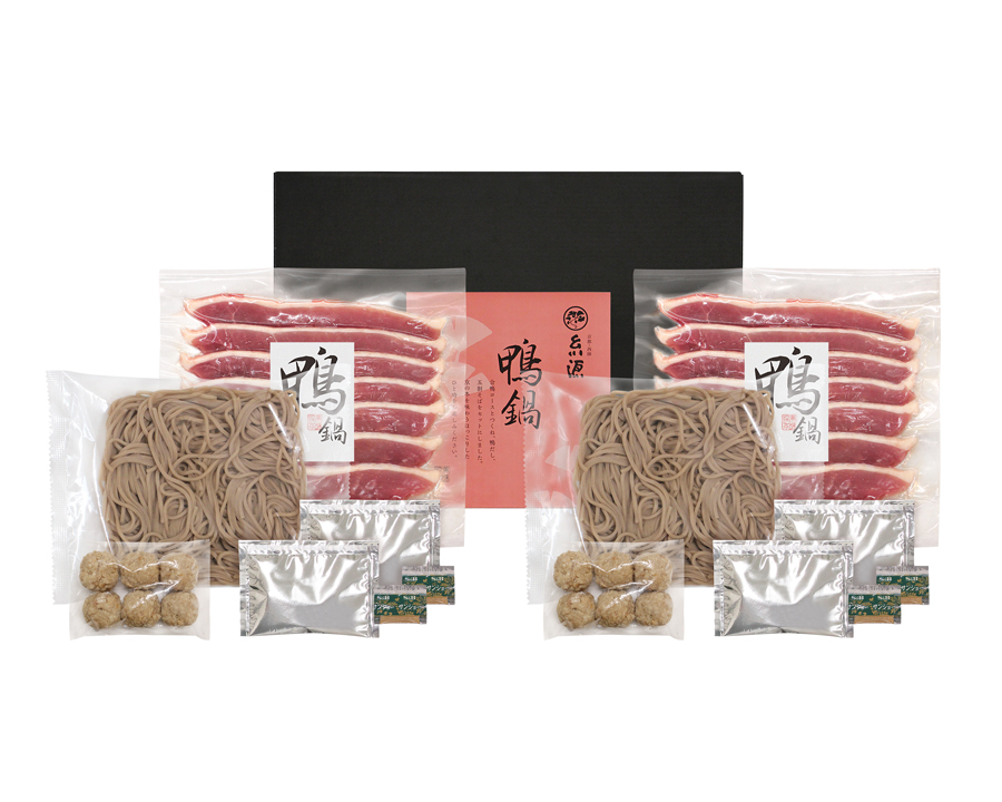 セット内容・・・鴨鍋セット4人前【(合鴨ロース約130g・合鴨つくね6個・五割そば200g)×各2、(鴨だし濃縮スープ30g・山椒0.2g)×各4】