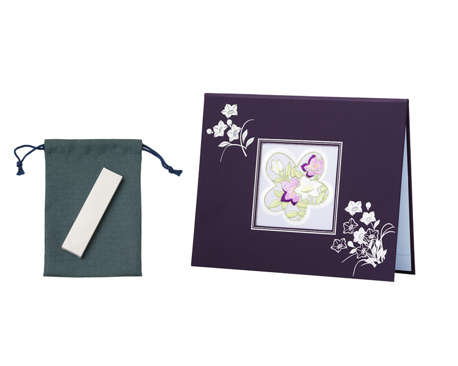 落ち着いた紫の台紙に、銀白と紫の糸でキキョウをあしらいました。