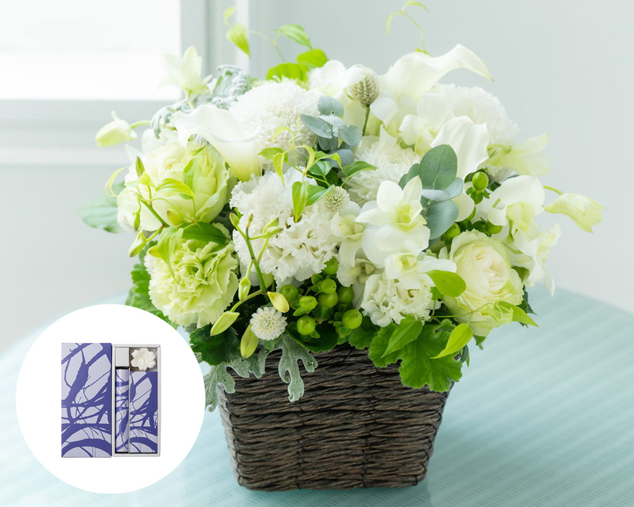 プロにおまかせアレンジメント 白上がり S[巾着・コシノジュンコ蝋燭線香付]