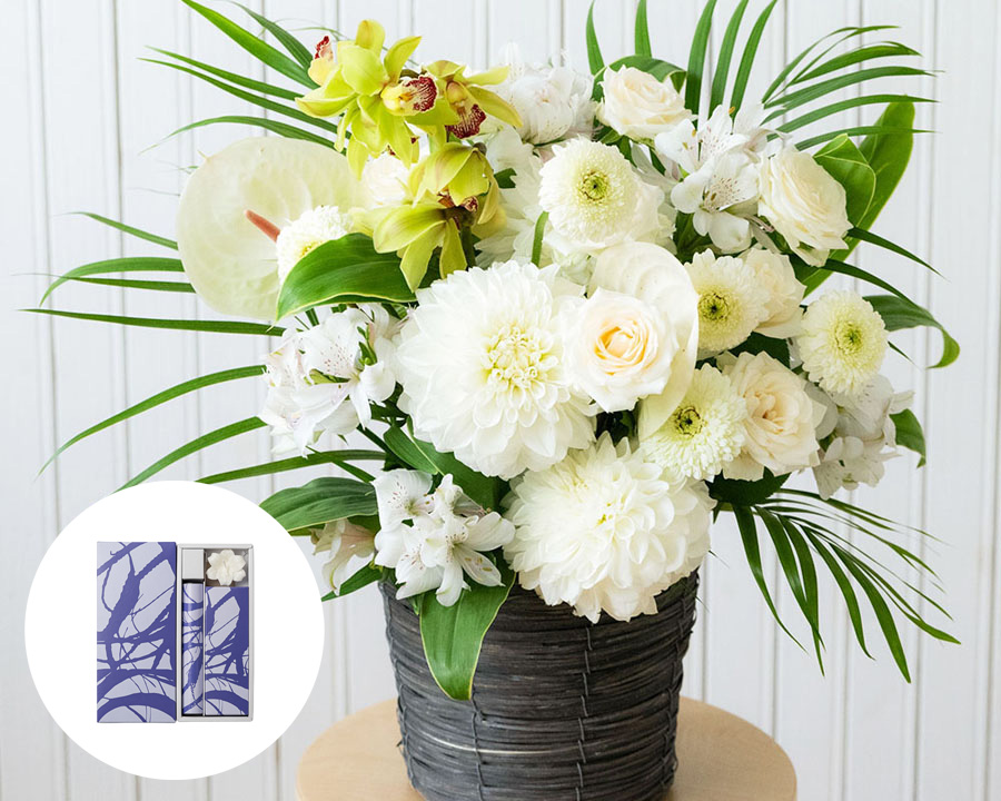 プロにおまかせ豪華アレンジメント 白上がり 3XL[巾着・コシノジュンコ蝋燭線香付]