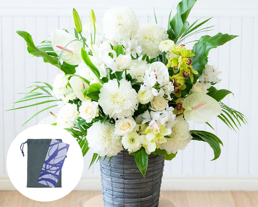 プロにおまかせアレンジメント 白上がり L[巾着・コシノジュンコ蝋燭線香付]