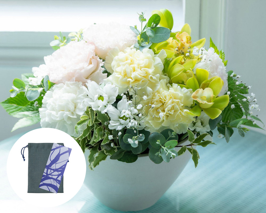 プロにおまかせアレンジメント 白上がり M[巾着・コシノジュンコ蝋燭線香付]