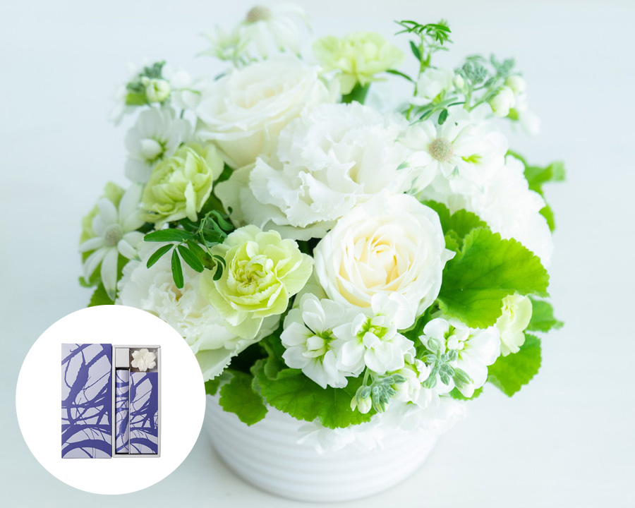 - フラワー:高さ約20cm×幅約20cm / コシノジュンコ蝋燭・線香セット:縦21.5㎝×横8.8㎝×高さ3.0㎝