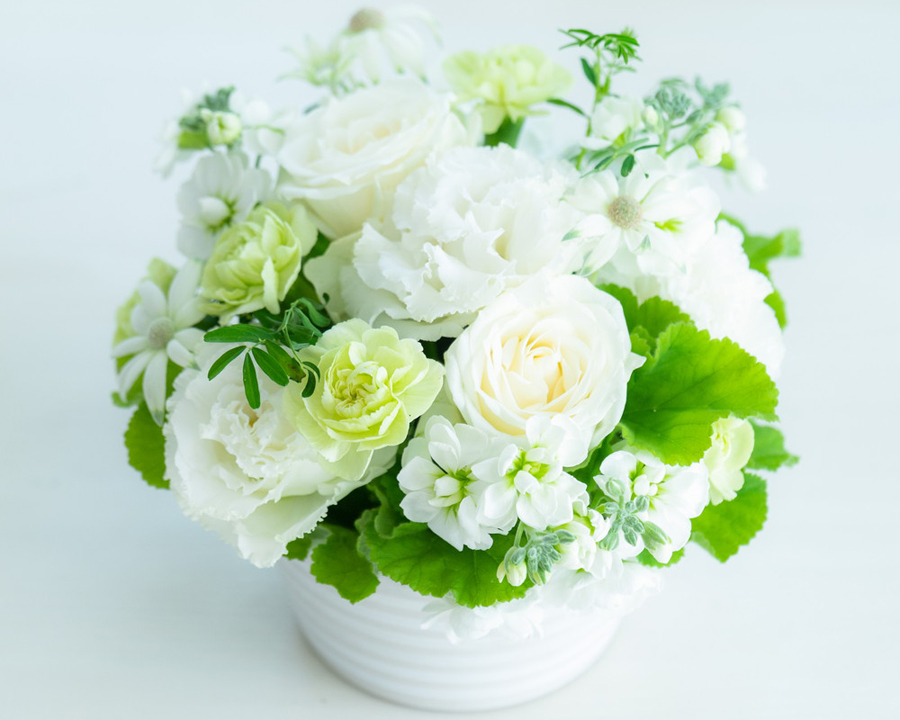 白系で仕上げたお悔やみのアレンジメント