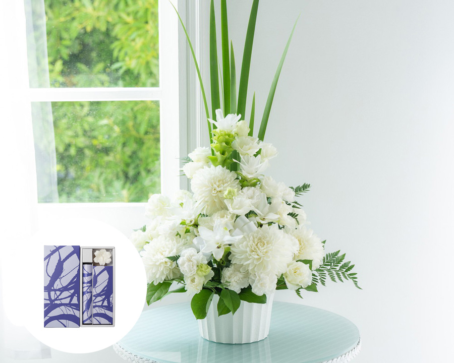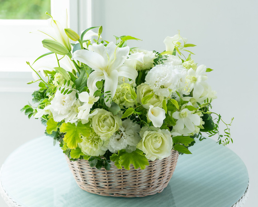白系で仕上げたお悔やみのアレンジメント