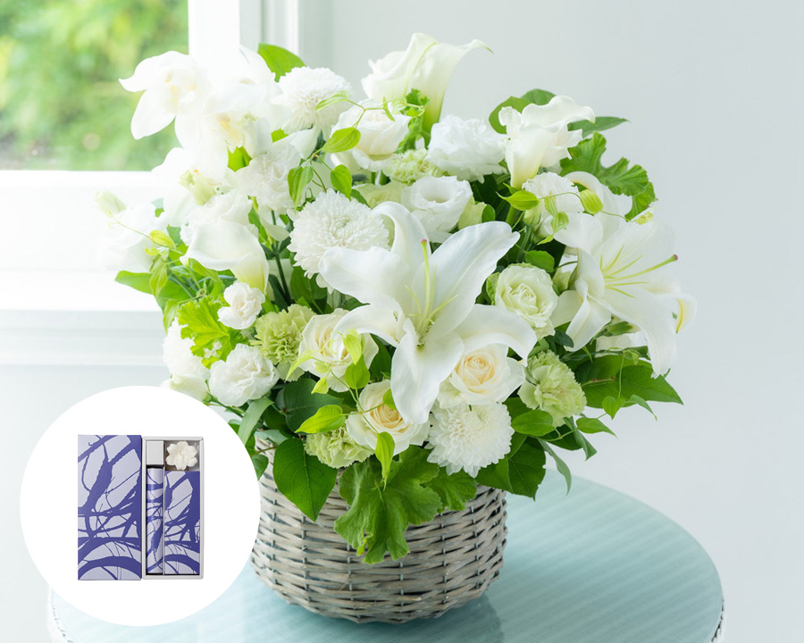 - フラワー:高さ約30cm×幅約30cm / コシノジュンコ蝋燭・線香セット:縦21.5㎝×横8.8㎝×高さ3.0㎝