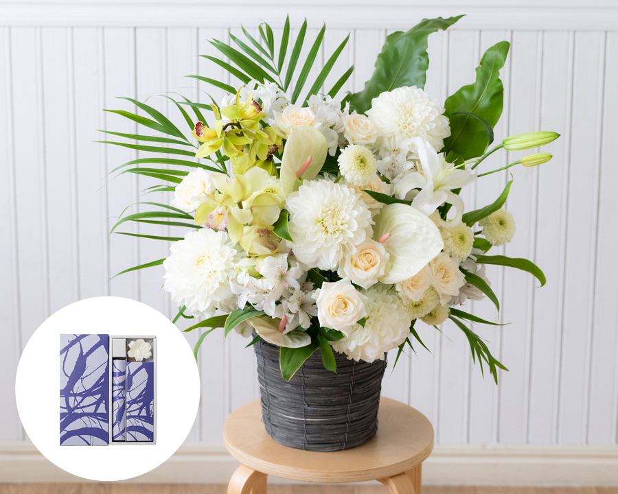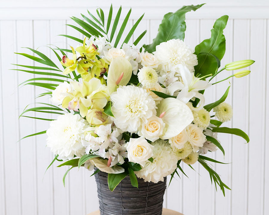 特別な方や法人様への贈り物にもご利用いただける白系で仕上げたお悔やみのアレンジメントです。