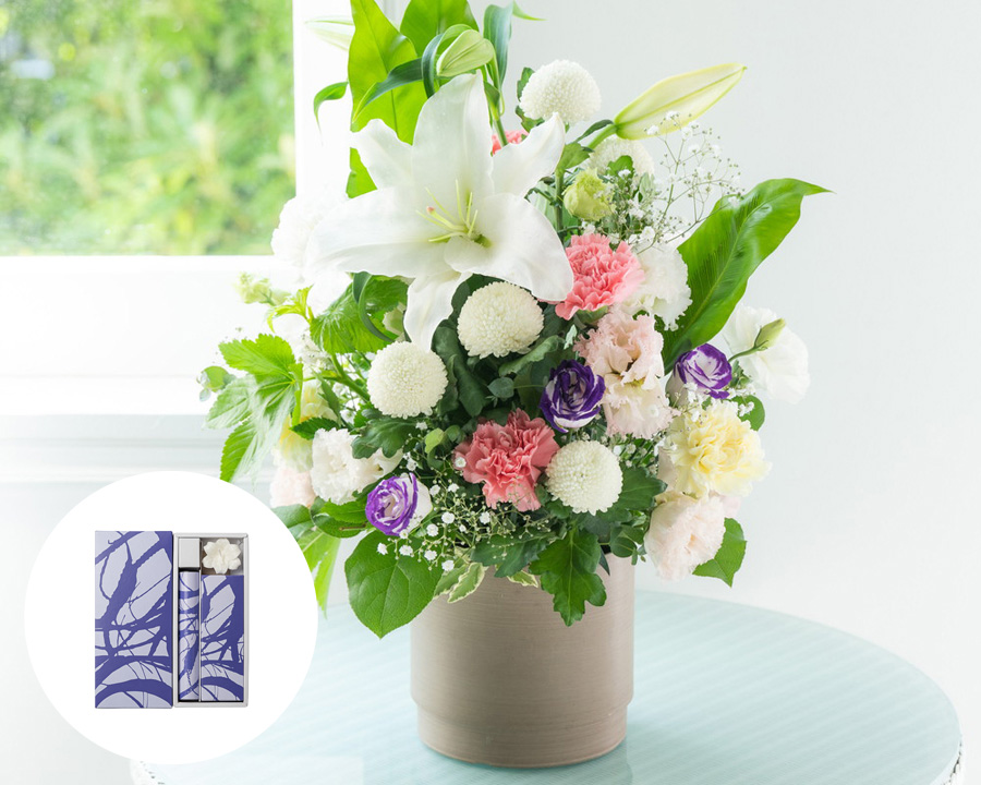 - フラワー:高さ約25cm×幅約25cm / コシノジュンコ蝋燭・線香セット:縦21.5㎝×横8.8㎝×高さ3.0㎝
