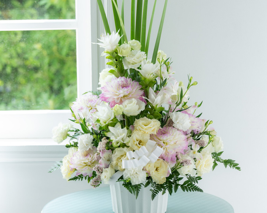 淡い色を入れたお悔やみのアレンジメント