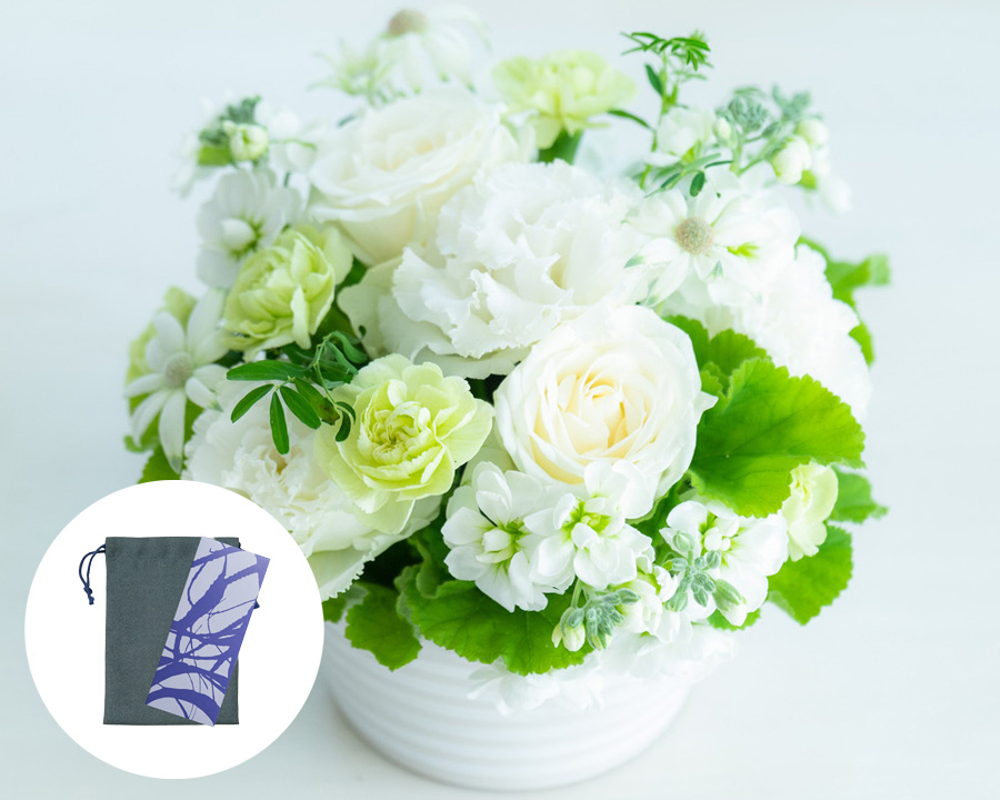 - フラワー:高さ約20cm×幅約20cm / コシノジュンコ蝋燭・線香セット:縦21.5㎝×横8.8㎝×高さ3.0㎝ / 巾着:縦23.0cm×横16.0cm