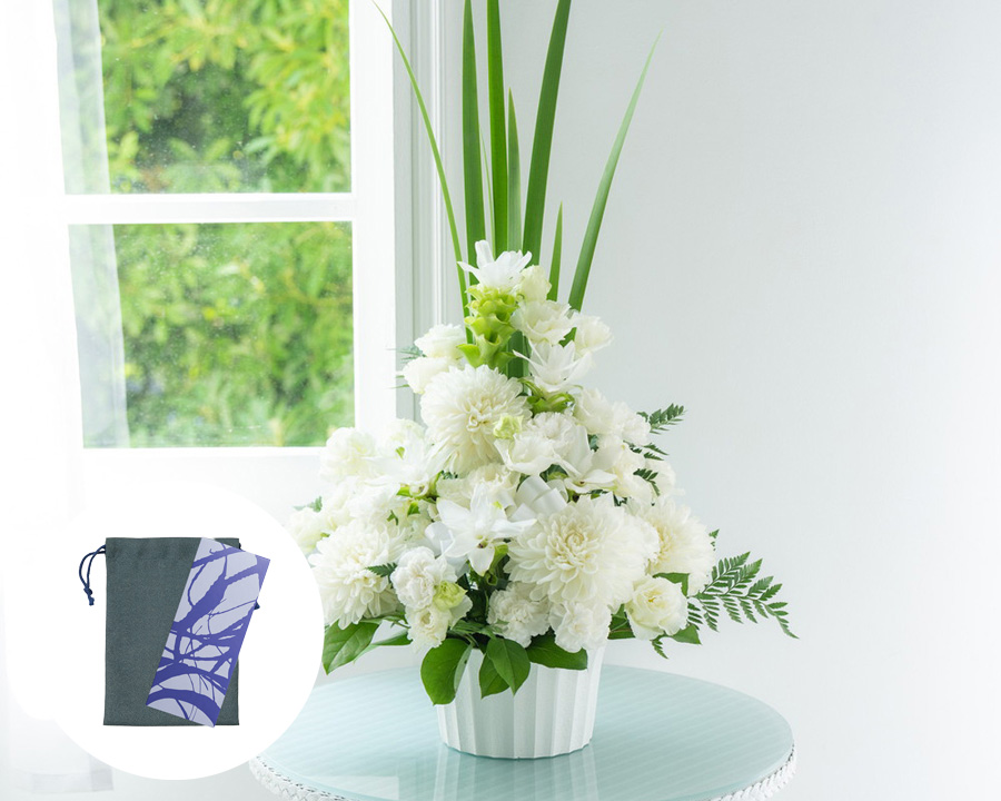 - フラワー:高さ約30cm×幅約30cm / コシノジュンコ蝋燭・線香セット:縦21.5㎝×横8.8㎝×高さ3.0㎝ / 巾着:縦23.0cm×横16.0cm