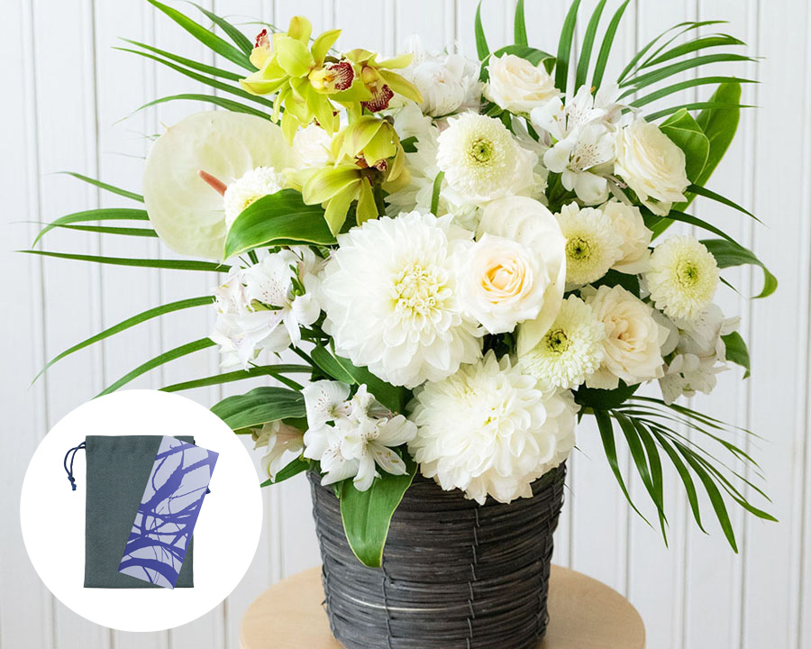 - フラワー:高さ約30cm×幅約50cm / コシノジュンコ蝋燭・線香セット:縦21.5㎝×横8.8㎝×高さ3.0㎝ / 巾着:縦23.0cm×横16.0cm