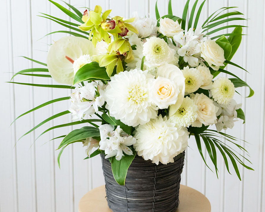 特別な方や法人様への贈り物にもご利用いただける白系で仕上げたお悔やみのアレンジメントです。