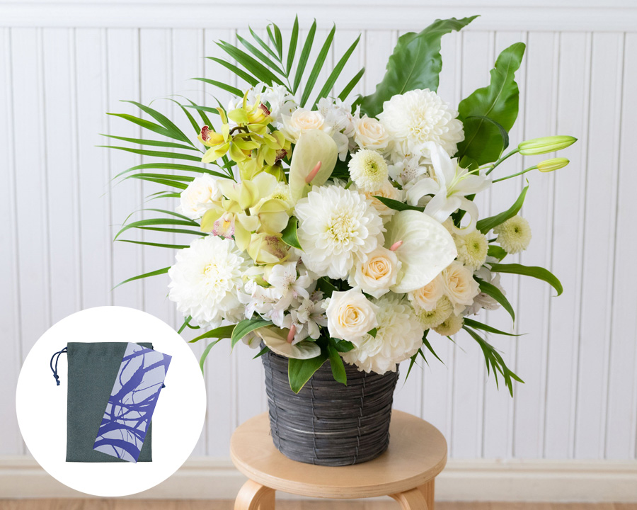 - フラワー:高さ約35cm×幅約60cm / コシノジュンコ蝋燭・線香セット:縦21.5㎝×横8.8㎝×高さ3.0㎝ / 巾着:縦23.0cm×横16.0cm