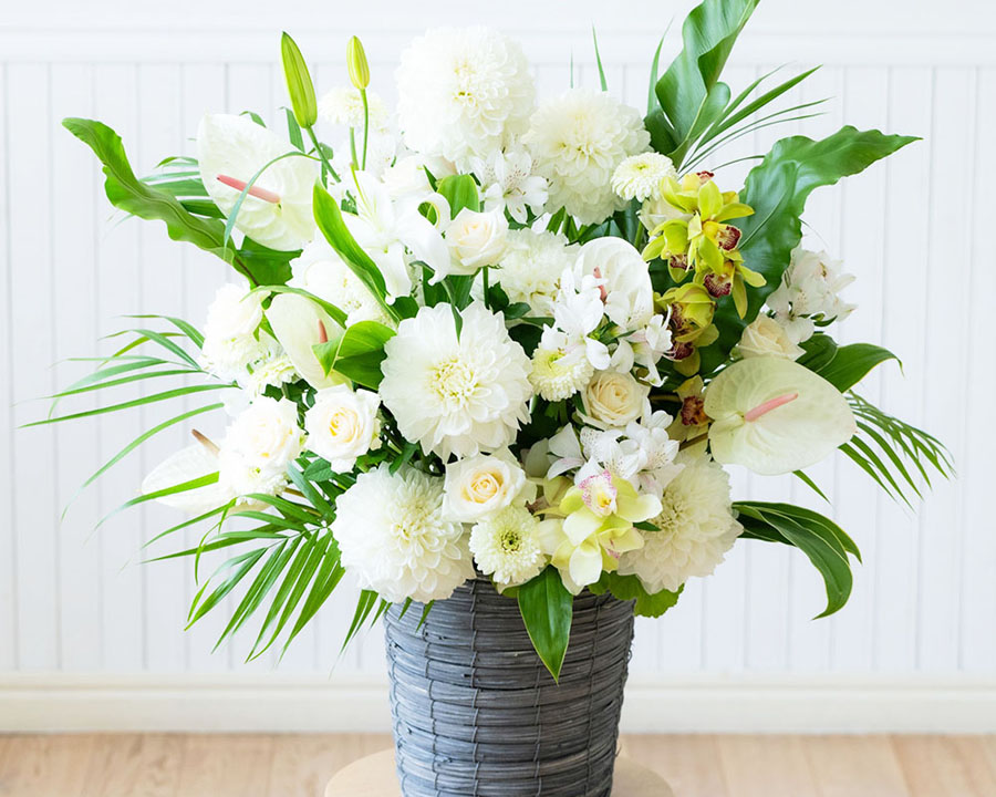 特別な方や法人様への贈り物にもご利用いただける白系で仕上げたお悔やみのアレンジメントです。