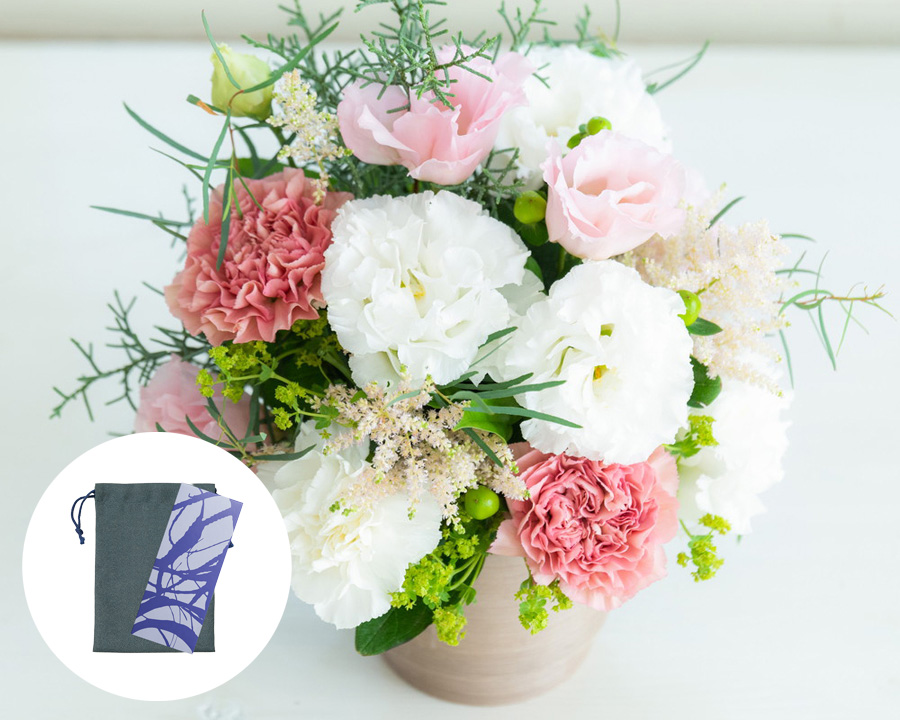 - フラワー:高さ約20cm×幅約20cm / コシノジュンコ蝋燭・線香セット:縦21.5㎝×横8.8㎝×高さ3.0㎝ / 巾着:縦23.0cm×横16.0cm