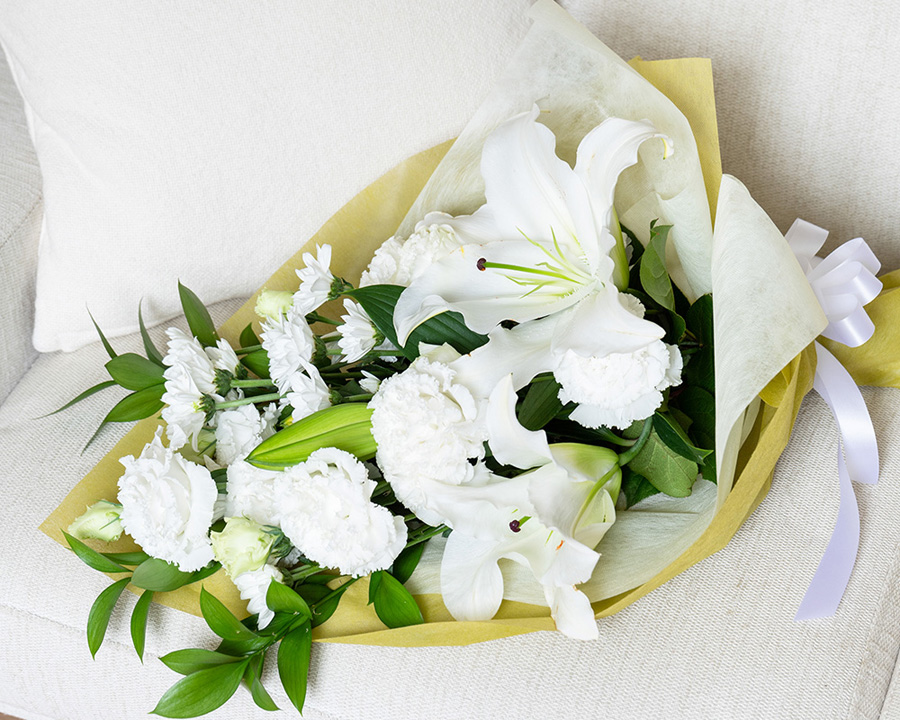 白でまとめた豪華な花束ユリを入れることで豪華な花束に仕上げました。