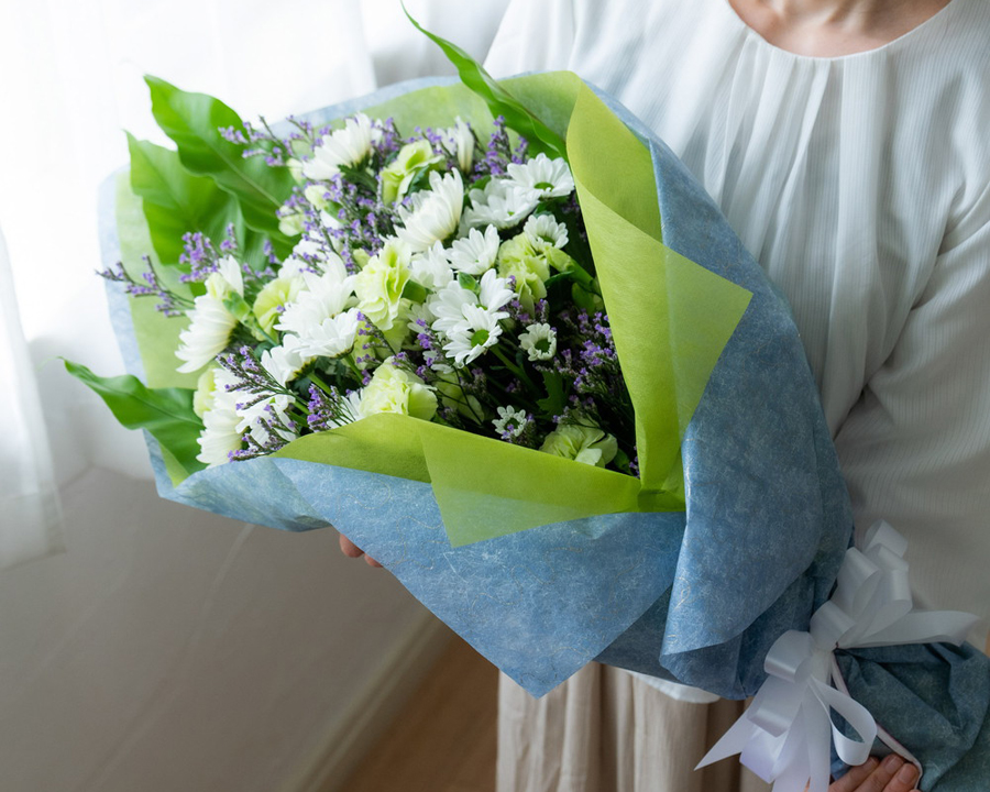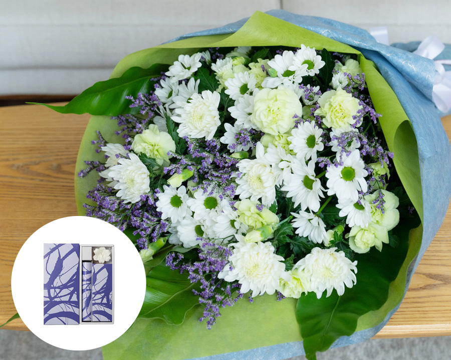 墓前やお仏壇に1対で飾れるお供え花束白のマムをメインにまとめたお供え花束。