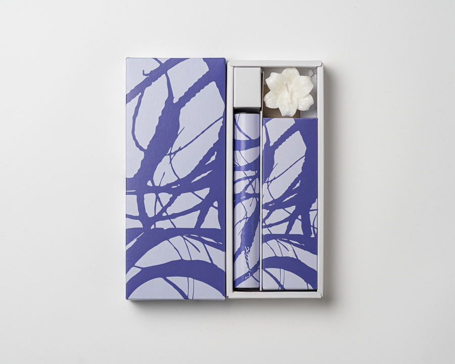 静寂と温かみをイメージし、紫で構成されたコシノジュンコのアートから