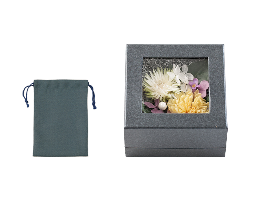- プリザーブドフラワー:縦12.0cm×横12.0cm×高さ7.0cm / 台紙:縦17.8cm×横23.0cm / 巾着:縦23.0cm×横16.0cm
