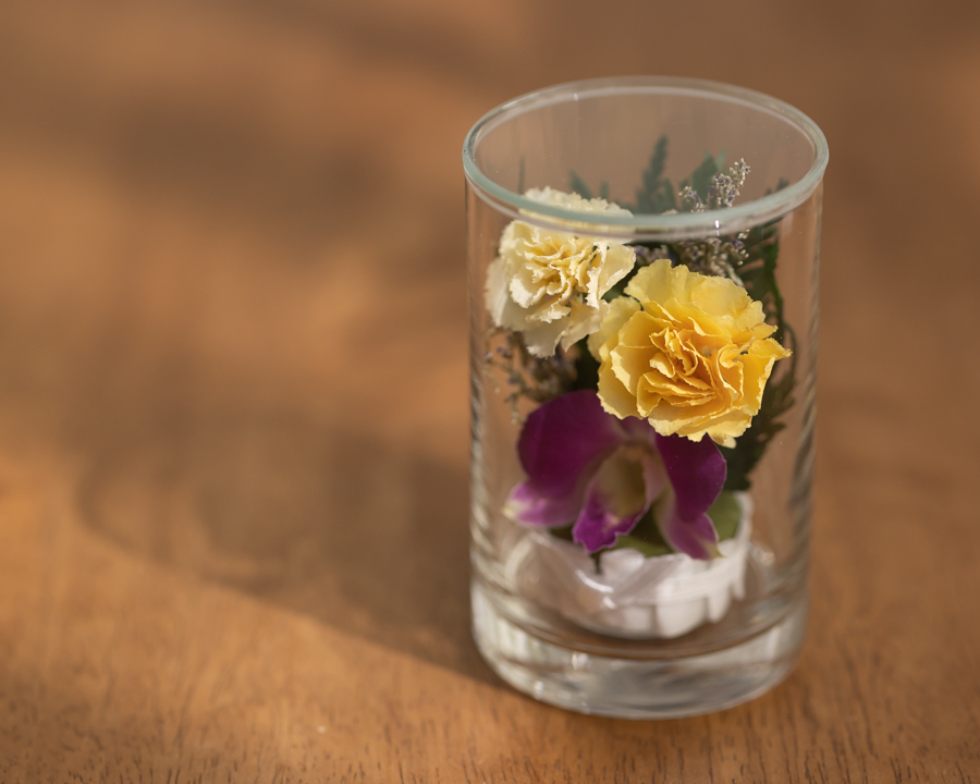透明度の高いクリスタルガラスの中に閉じ込めたアレンジです。