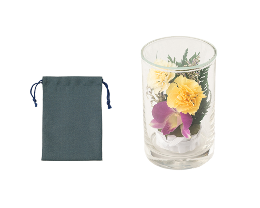 - グラスフラワー:縦6.5cm×横6.5cm×高さ10.0cm/ 台紙:縦17.8cm×横23.0cm / 巾着:縦23.0cm×横16.0cm