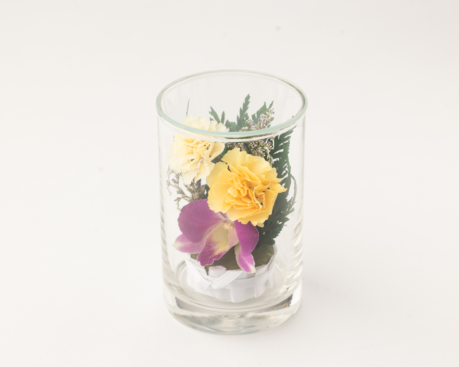 透明度の高いクリスタルガラスの中に閉じ込めたアレンジです。